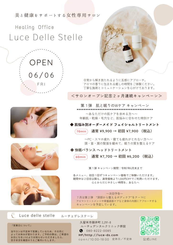 また、リフレクソロジーやクレイセラピー、心理面へのアプローチなど、多方面での学びを活かしながら、心と身体の両面に寄り添うトリートメントをお届けいたします。